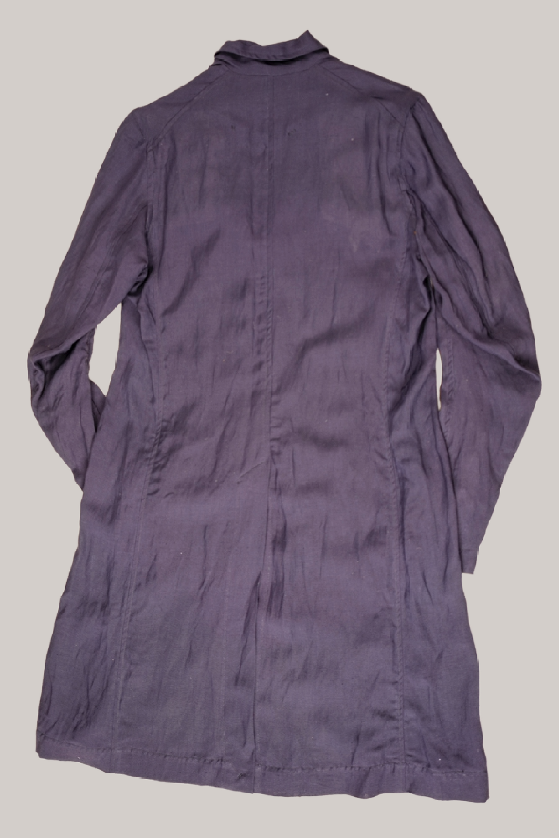 Crafted from light-weight 100% linen, the coat moves with a quiet fluidity, its raw details whispering of time spent in the hands of its maker. Every stitch, bound with tape and meticulously finished, is a deliberate act of exposure—a reminder that imperfection is not to be concealed, but revered.