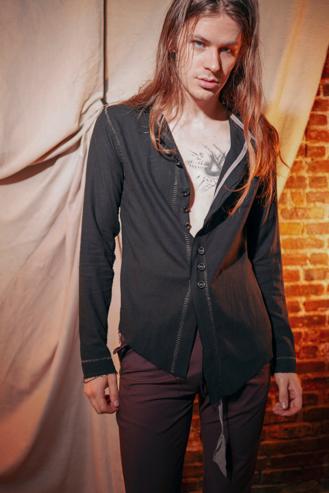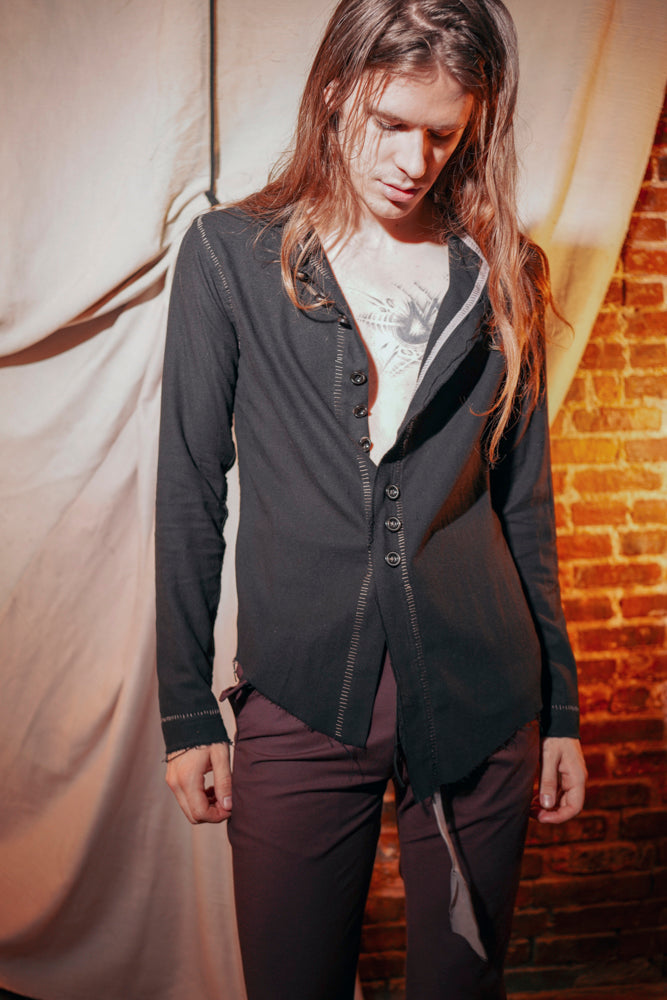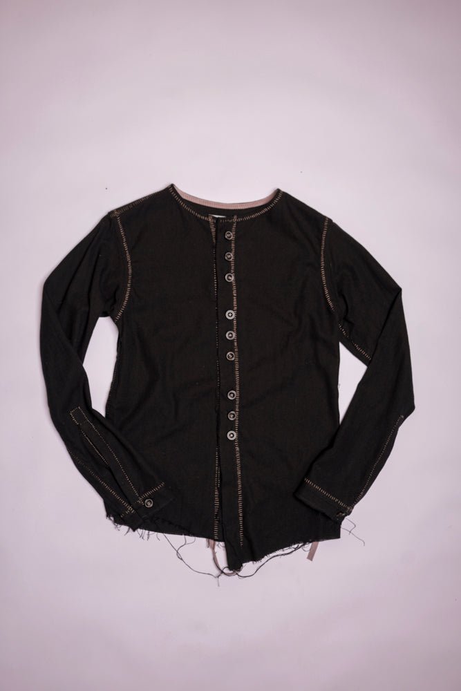 Cut from soft, medium-weight linen and sew entirely by had with silk thread, the Joint Shirt fits close to the body with an easy, natural line. The seams are left visible, giving quiet structure to an otherwise simple form. Raw hems at the sleeves and body lend a sense one wear and honesty - a garment that feels both refined and unfinished in equal measure.