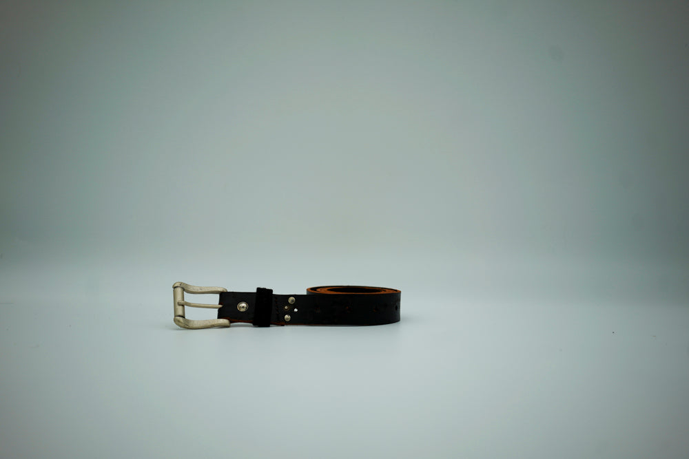 Thick54, lightly textured, and hole-punched throughout, paired with a custom-molded buckle cast in the USA. The strap tapers into a long tail that can be knotted or left to swing—your call.